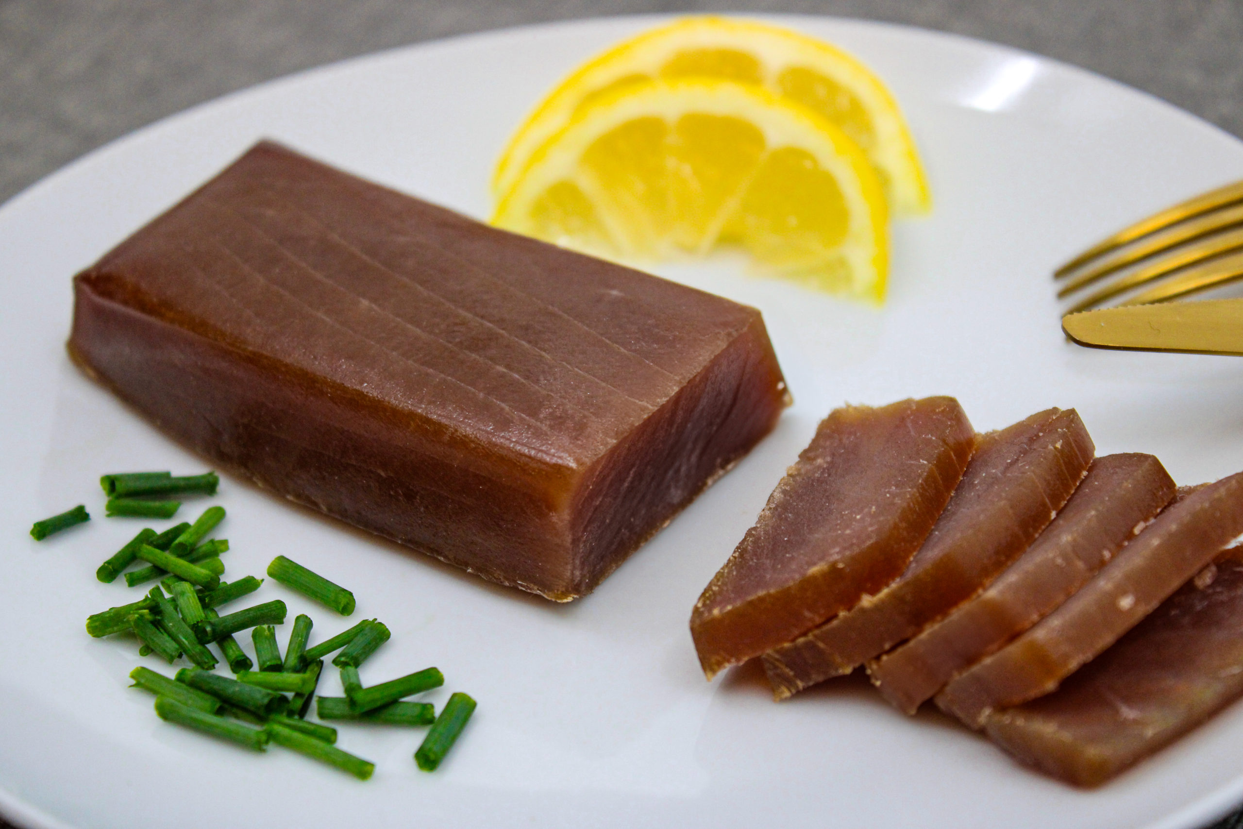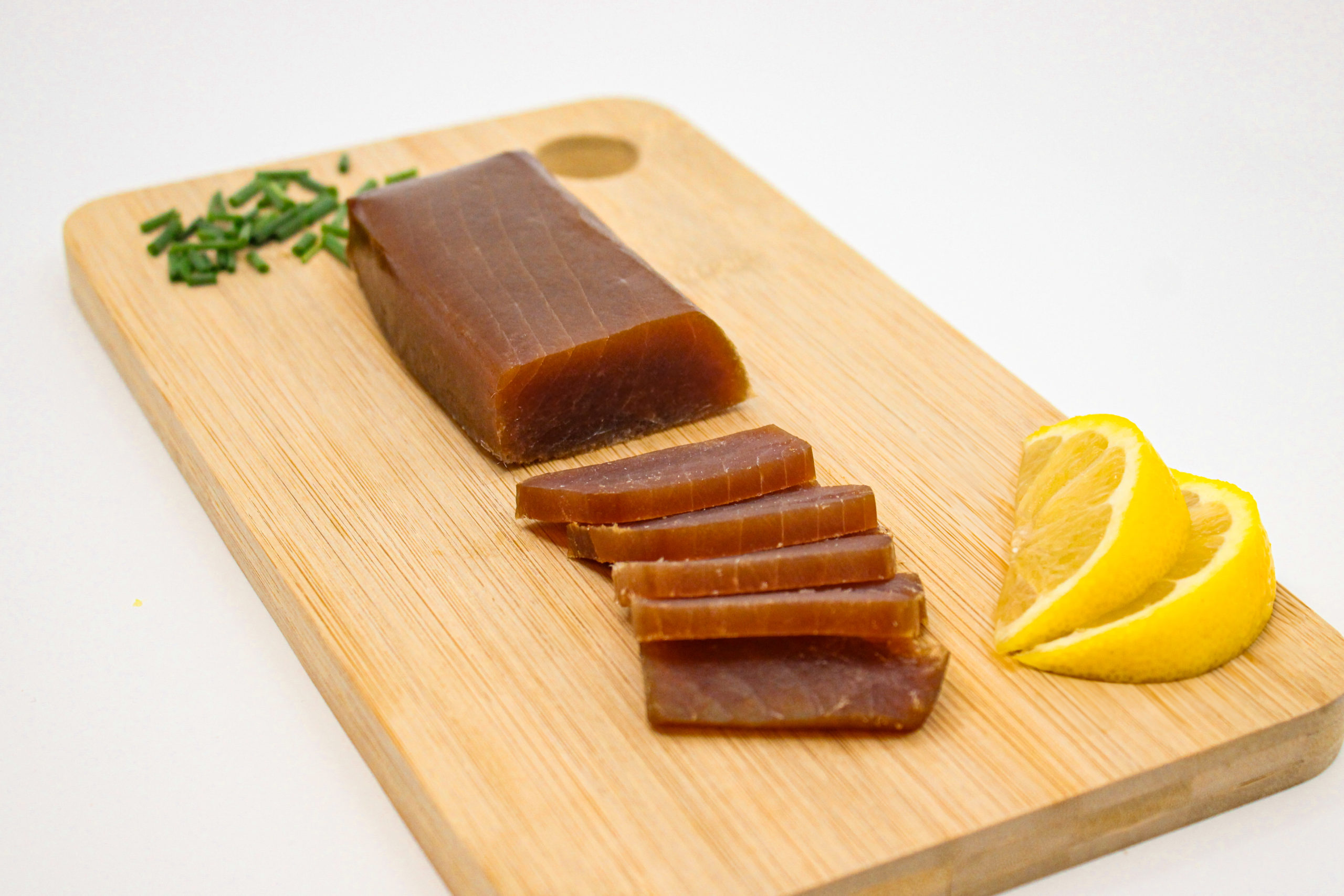 The heart of the Albacore tuna, the meatiest part of the fish, is distinguished by its ultra-tender texture. Cold-smoked over beech wood and dry-salted, it is best enjoyed cold in thin slices, perfect as an appetizer or in more refined dishes, such as on focaccia accompanied by burrata and hazelnut pesto.